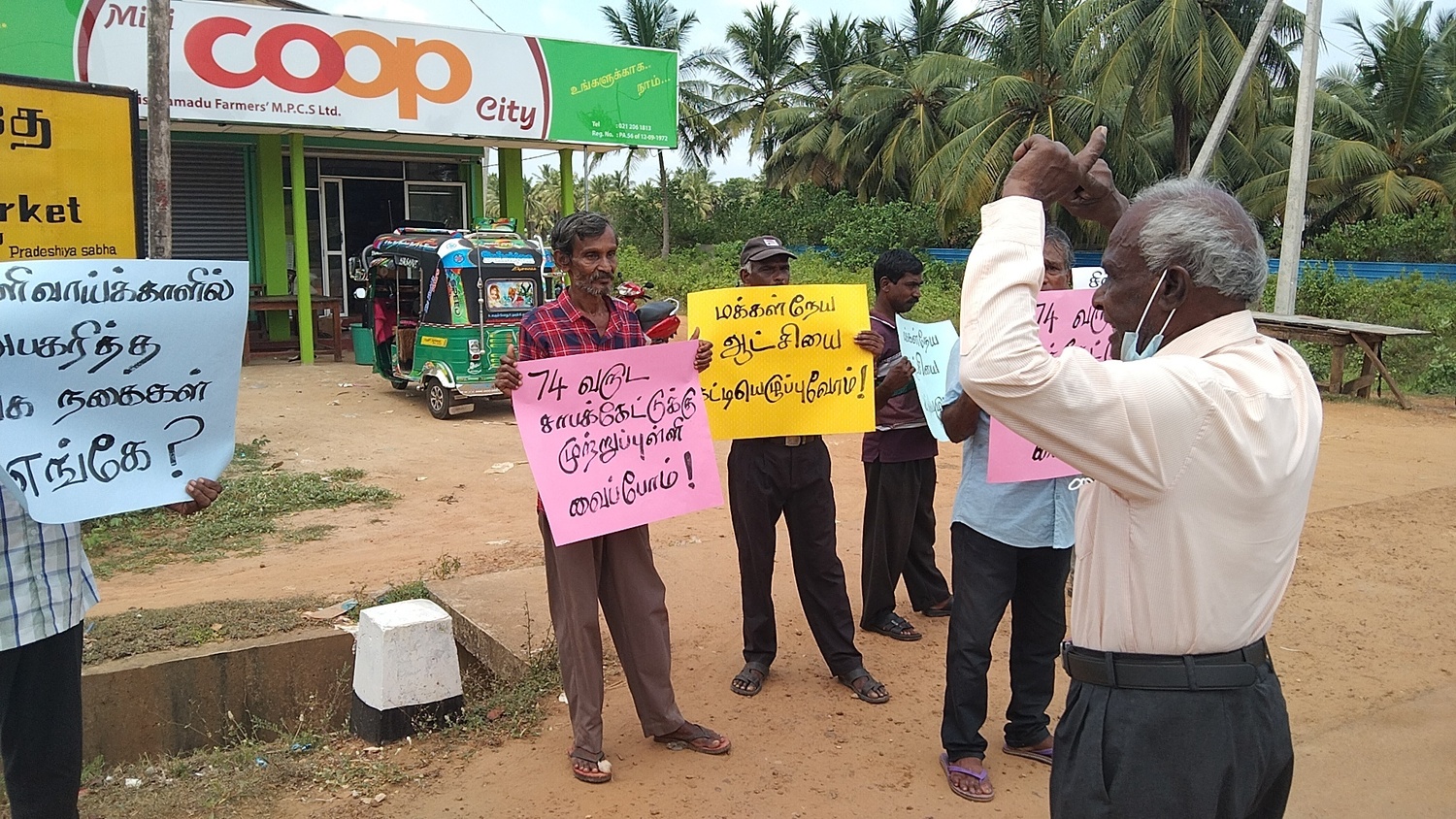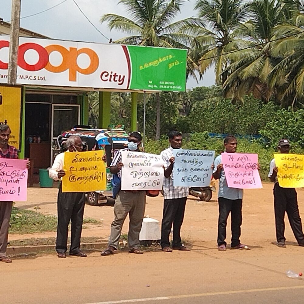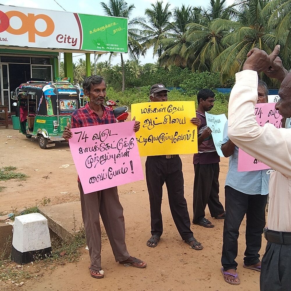 மக்கள் விடுதலை முன்னணியின் கிளிநொச்சி மாவட்ட இணைப்பாளர் மோகன் தலைமையில் குறித்த போராட்டம் முன்னெடுக்கப்பட்டது.