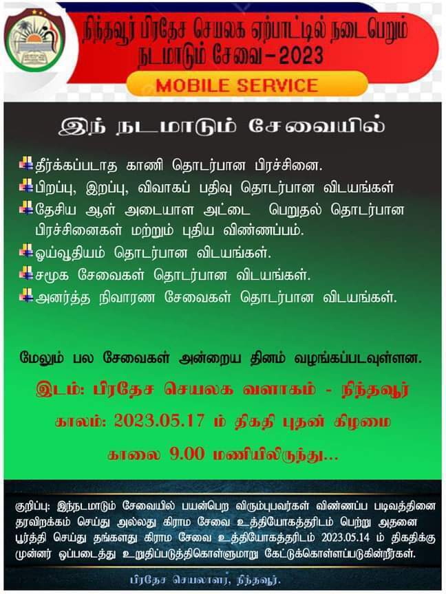 இந்த நடமாடும் சேவைகளில் குறிப்பாகப் பொது மக்களின் தீர்க்கப்படாத காணி தொடர்பான பிரச்சினைகள், பிறப்பு, இறப்பு, விவகாப்பதிவு தொடர்பான பிரச்சினைகள், தேசிய ஆள் அடையாள அட்டை பெறுதல் தொடர்பான பிரச்சினைகள் மற்றும் புதிய விண்ணப்பம், ஓய்வூதியம் தொடர்பான விடயம், சமூக சேவைகள் தொடர்பான விடயங்கள், அனர்த்த நிவாரண சேவைகள் தொடர்பான விடயங்கள் போன்றவற்றிற்குத் தீர்வுகள் வழங்கப்படவுள்ளமை குறிப்பிடத்தக்கது.