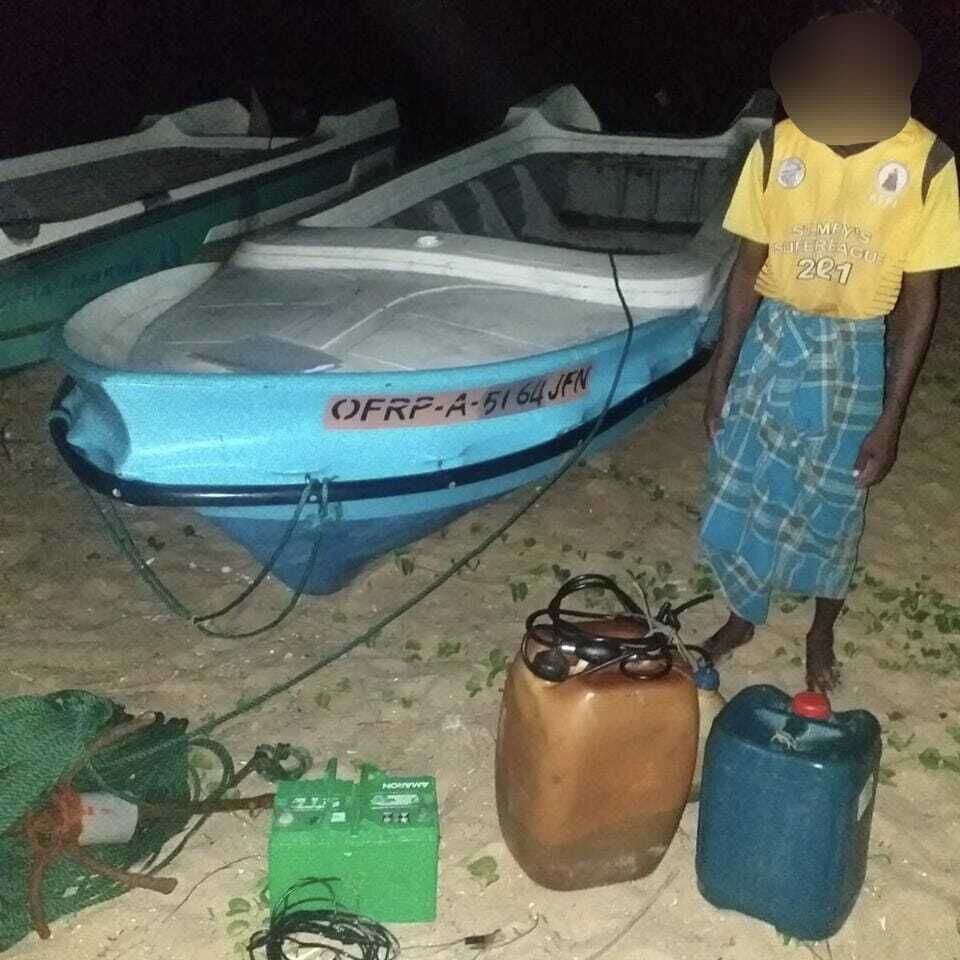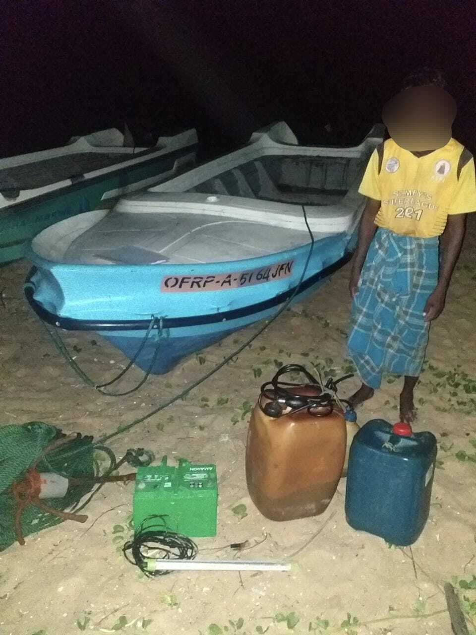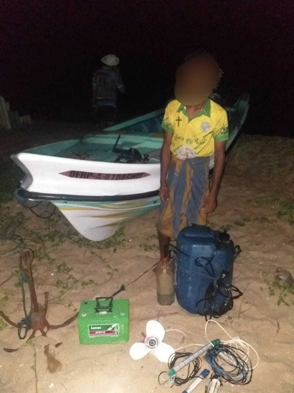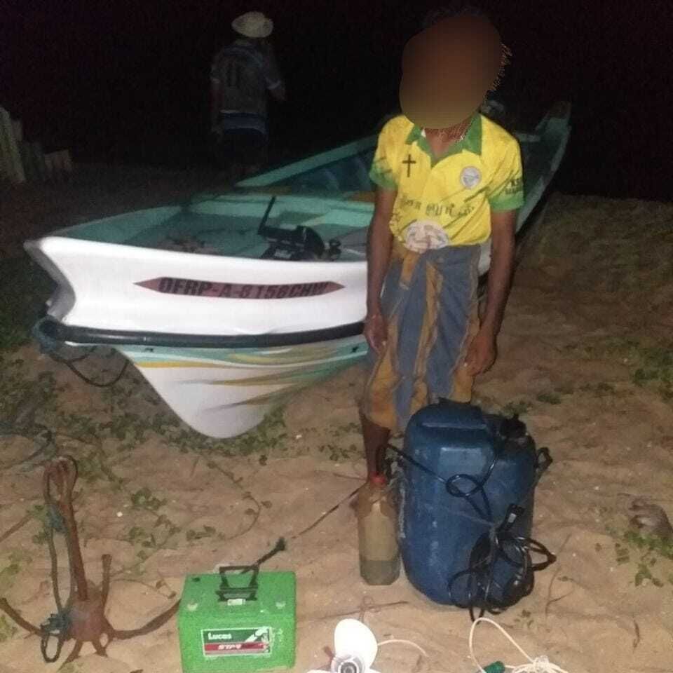 வடமராட்சி கிழக்கு கட்டைக்காடு கடற்பகுதியில் வெற்றிலைக்கேணி கடற்படையினர் 02.05.2024 அன்று மேற்கொண்ட திடீர் சுற்றிவளைப்பில் சட்டவிரோதமாக ஒளிபாய்ச்சி மீன்பிடியில் ஈடுபட முயன்ற மூவர் கைது செய்யப்பட்டுள்ளனர்.