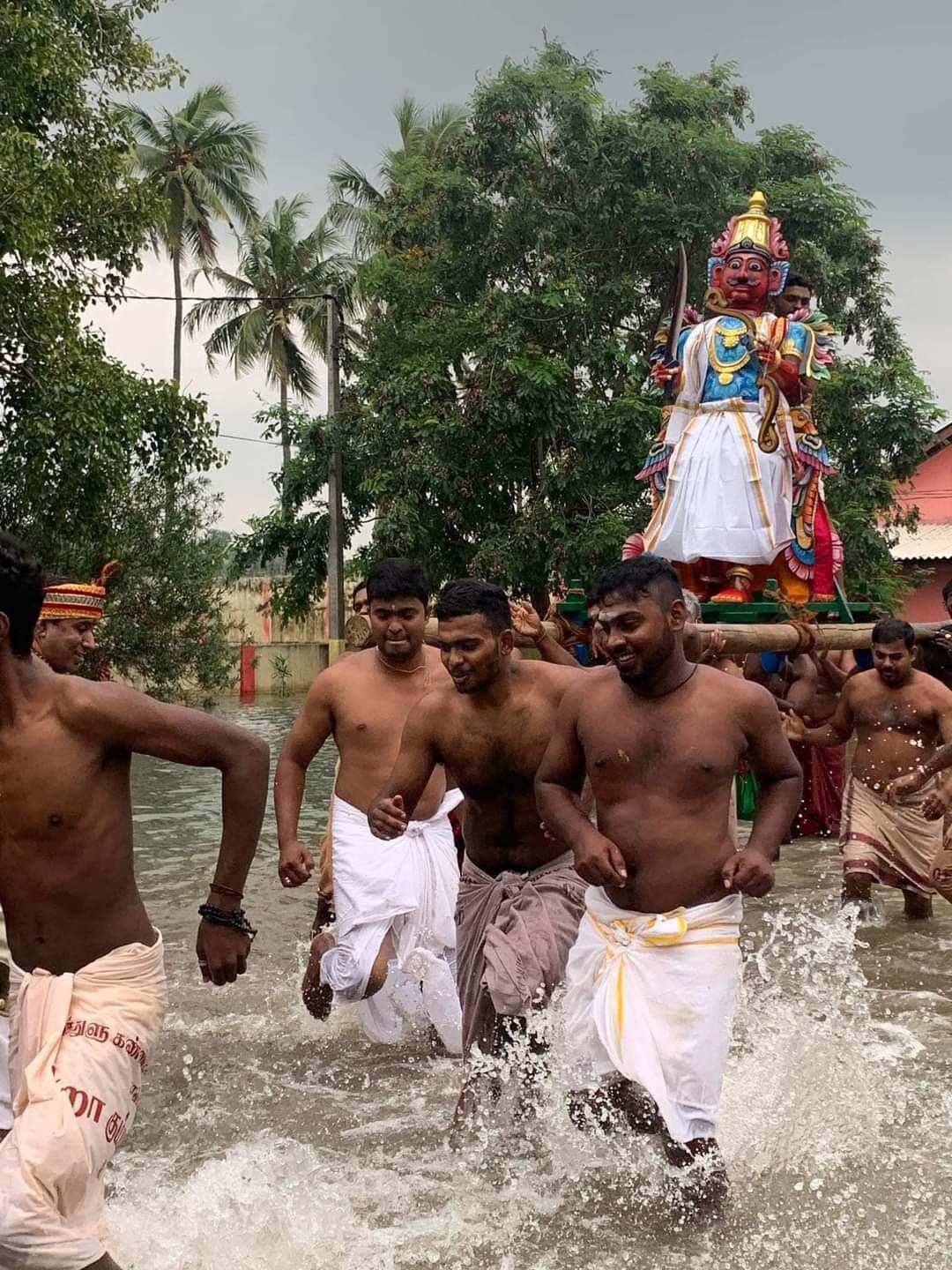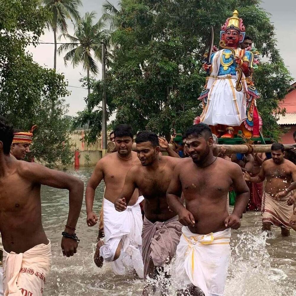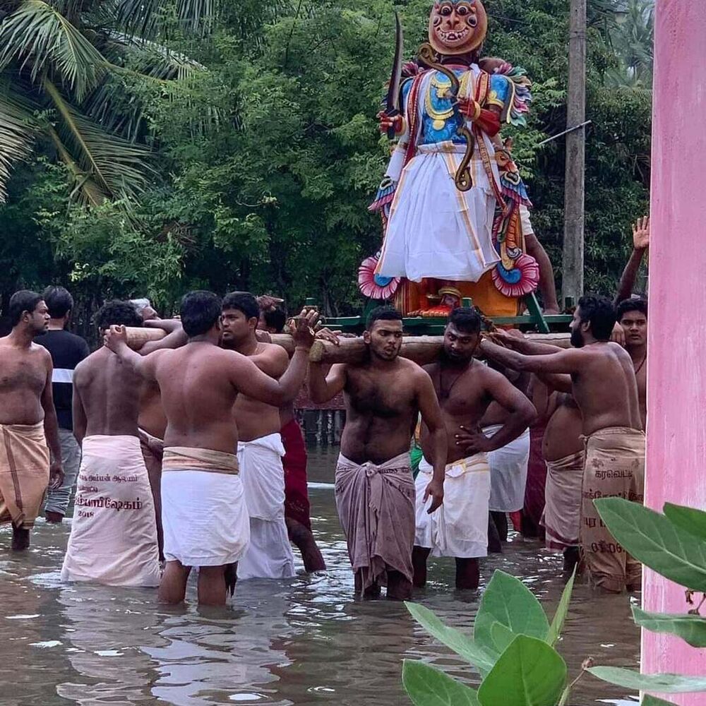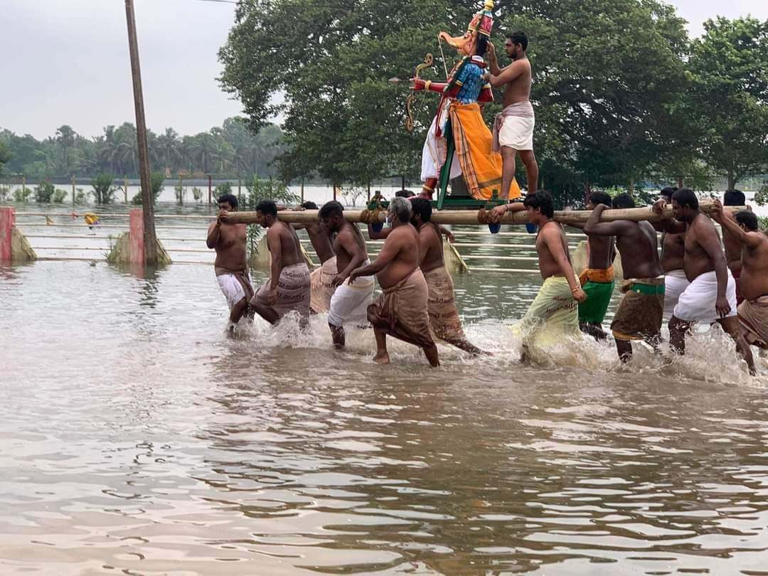 மானிப்பாய் சுதுமலை புவனேஸ்வரி அம்மன் ஆலயத்தில் வெள்ளத்துக்கு மத்தியில் சூரன் போர் இடம்பெறும் காட்சி