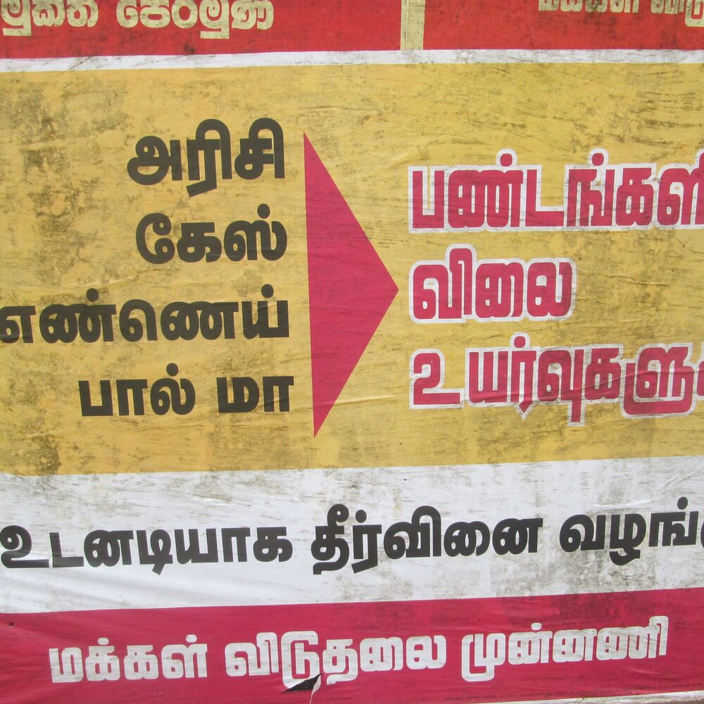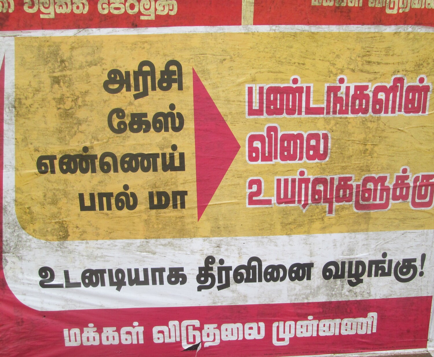 “அரிசி, எரிவாயு (கேஸ்), எண்ணெய், பால்மா முதலான பண்டங்களின் விலை உயர்வுகளுக்கு உடனடியாகத் தீர்வினை வழங்கு” எனும் வாசகத்தையும், வலியுறுத்தலையும் கொண்ட மக்கள் விடுதலை முன்னணியின் தமிழ், சிங்கள மொழிகளிலான சுவரொட்டிகள் கிழக்கு உட்பட நாட்டின் பல பிரதேசங்களிலும் ஒட்டப்பட்டுள்ளன.