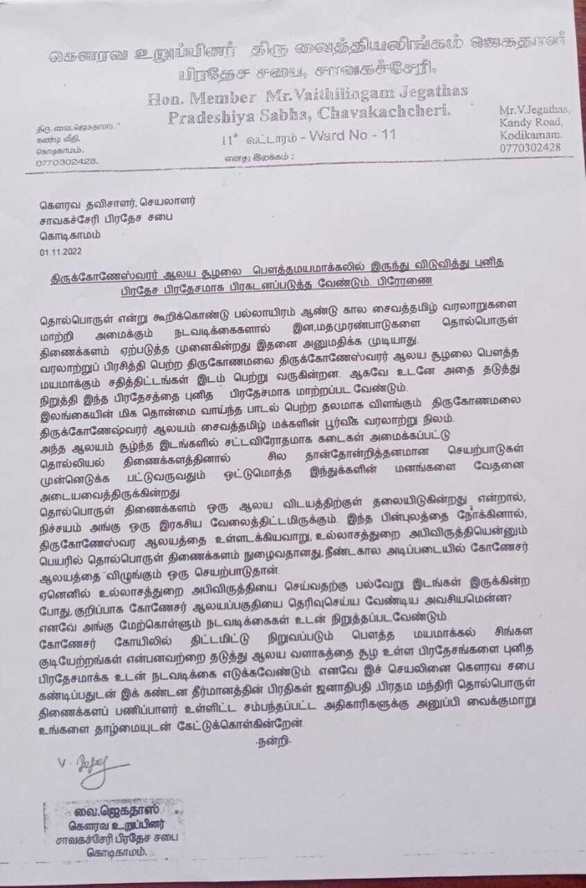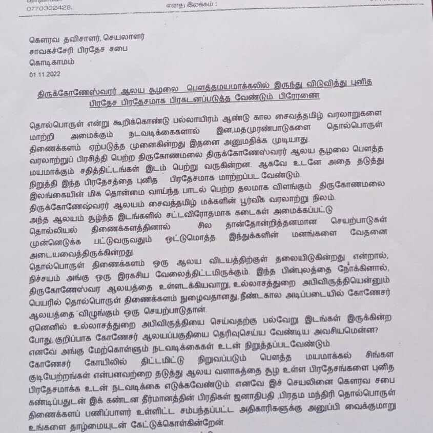 வரலாற்றுப் பிரசித்தி பெற்ற திருகோணமலை திருக்கோணேஸ்வரர் ஆலய சூழலை பௌத்த மயமாக்கும் சதித் திட்டங்கள் இடம் பெற்று வருகின்றன. ஆகவே உடனே அதை தடுத்து நிறுத்தி இந்த பிரதேசத்தை புனித பிரதேசமாக மாற்றப்பட வேண்டும்.