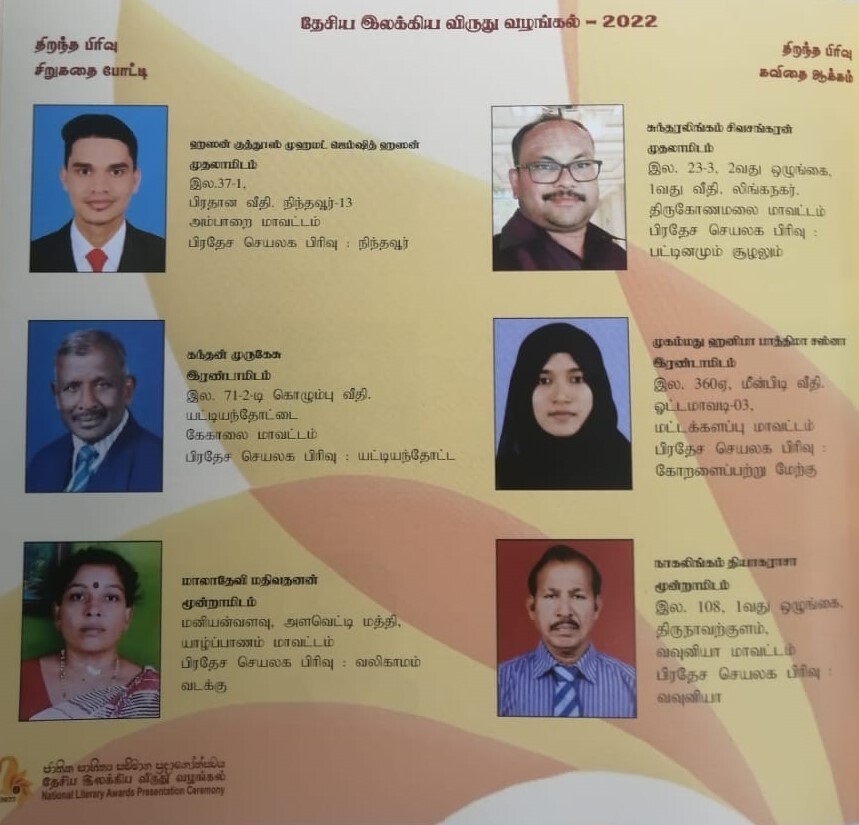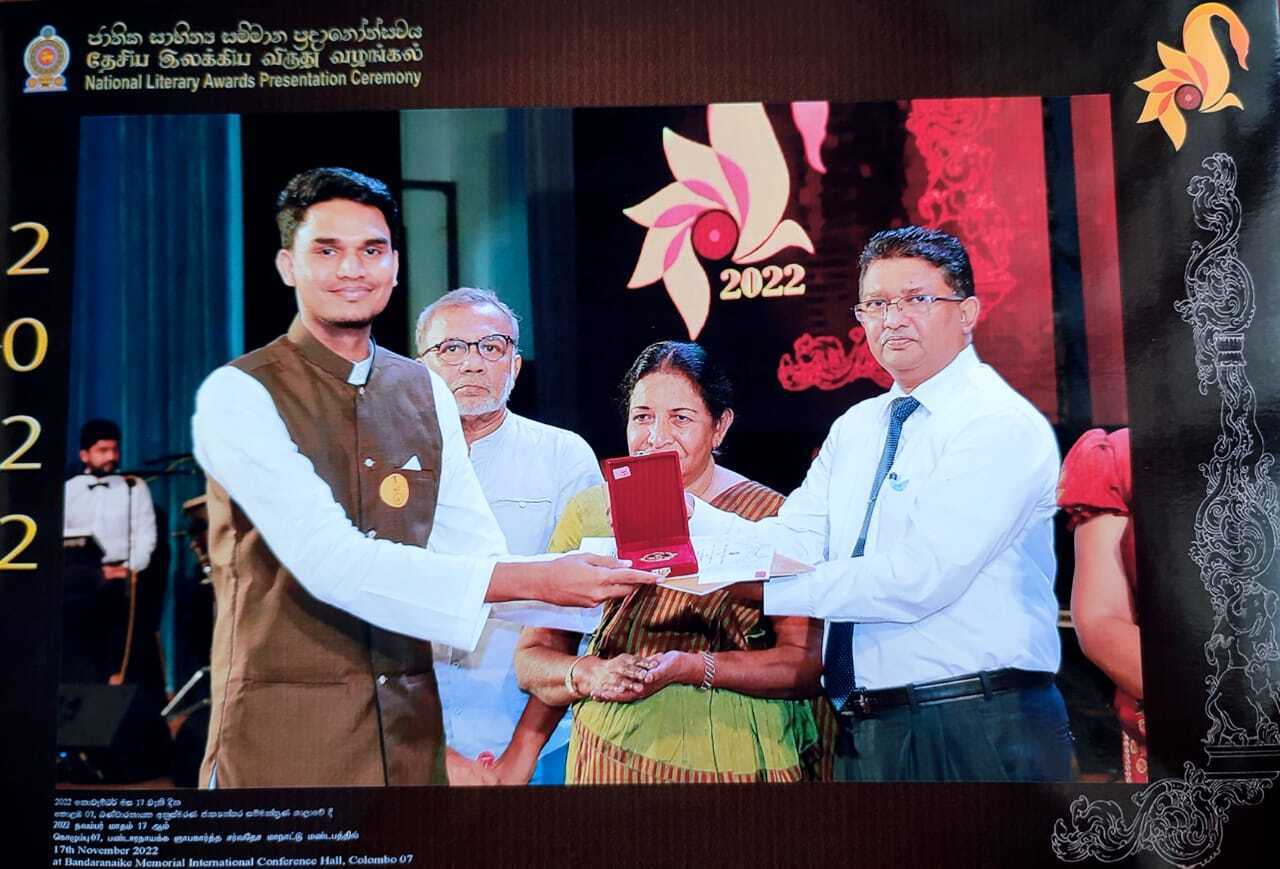 வெற்றியீட்டிய இவர்களுக்கான விருதுகளும், சான்றிதழ்களும் கொழும்பில் நடைபெற்ற தேசிய இலக்கிய விருது வழங்கும் விழாவில் வழங்கிவைக்கப்பட்டன.