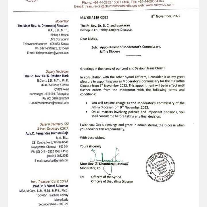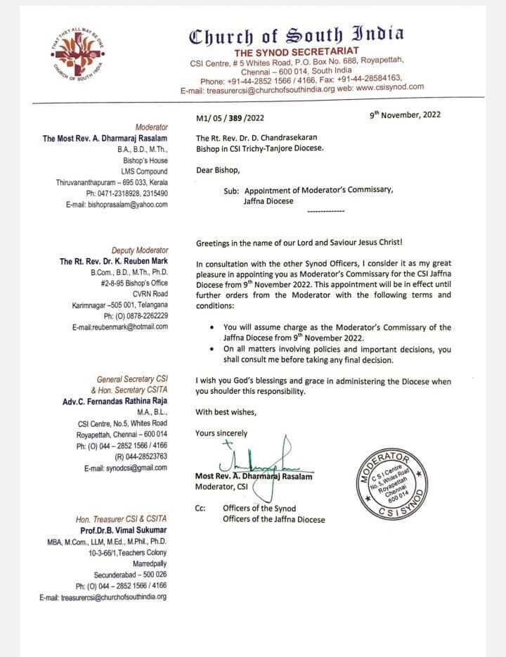 தென்னிந்திய திருச்சபை யாழ்ப்பாண ஆதீனத்தின் பிரதம பேராயரின் ஆணையாளராக திருச்சி - தஞ்சாவூர் ஆதீனத்தின் பேராயர் அதி வணக்கத்துக்குரிய கலாநிதி D. சந்திரசேகரன் இன்று நியமனம்