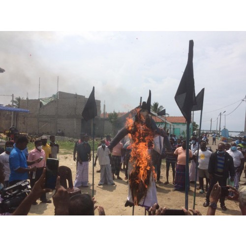 சுமந்திரனுக்கு எதிரான கோஷங்கள் எழுப்பப்பட்டு மீனவர்களால் போராட்டம் முன்னெடுக்கப்பட்டு, போராட்டத்தின் முடிவில் சுமந்திரனின் உருவப் பொம்மைக்கு செருப்பு மாலை அணிவிக்கப்பட்டு பெற்றோல் ஊற்றி எரிக்கப்பட்டதோடு உருவப் பொம்மைக்கு தடிகளால் மீனவர்கள் தாக்குதலையும் மேற்கொண்டனர்.