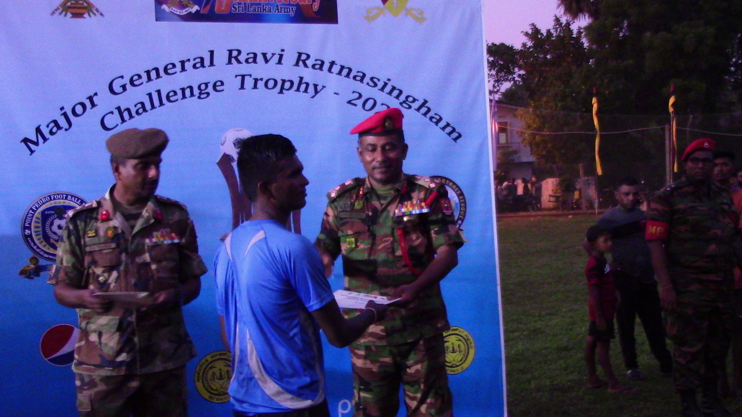 இலங்கை இராணுவத்தின் 551 வது படைப்பிரிவிற்க்கு உட்பட்ட பருத்தித்துறை, மற்றும் கரவெட்டி பிரிதேச செயலர் பிரிவுகளுக்குள் 18 கழகங்களுக்கு இடையில் நடாத்தப்பட்ட ஓய்வு பெற்ற இராணுவ மேஜர் ஜெனரல் ரவி ரட்ணசிங்கம் கிண்ணத்திற்க்கான உதைபந்தாட்ட போட்டியில் யாழ் பாதுகாப்பு படைகளின் கட்டளைத் தளபதி மேஜர் ஜெனரல் சந்தன விஜயசுந்தர, 55 வது படை பிரிவு தளபதி மேஜர் ஜெனரல் பிரசன்ன குணரத்ன, 51 வது படைப்பிரிவு தளபதி மேஜர் ஜெனரல் மகேந்திர பிரணாந்து, பருத்தித்துறை பிரதேச செயலர் ஆழ்வாப்பிள்ளை சிறி, பருத்தித்துறை நகரசபை தலைவர் இருதயராசா, பருத்தட்துறை பிரதேச சபை தவிசாளர் சா. அரியகுமார், இலங்கை இராணுவத்தின் 551 படைப்பிரிவின் பிரிகேடியர் சிந்திக்க விக்கிரமசிங்க, கேணல் ரூவன் பெர்ணாண்டோ, உட்பட்டவர்கள் இராணுவ அதிகாரிகள் கலந்து கொண்டனர்.