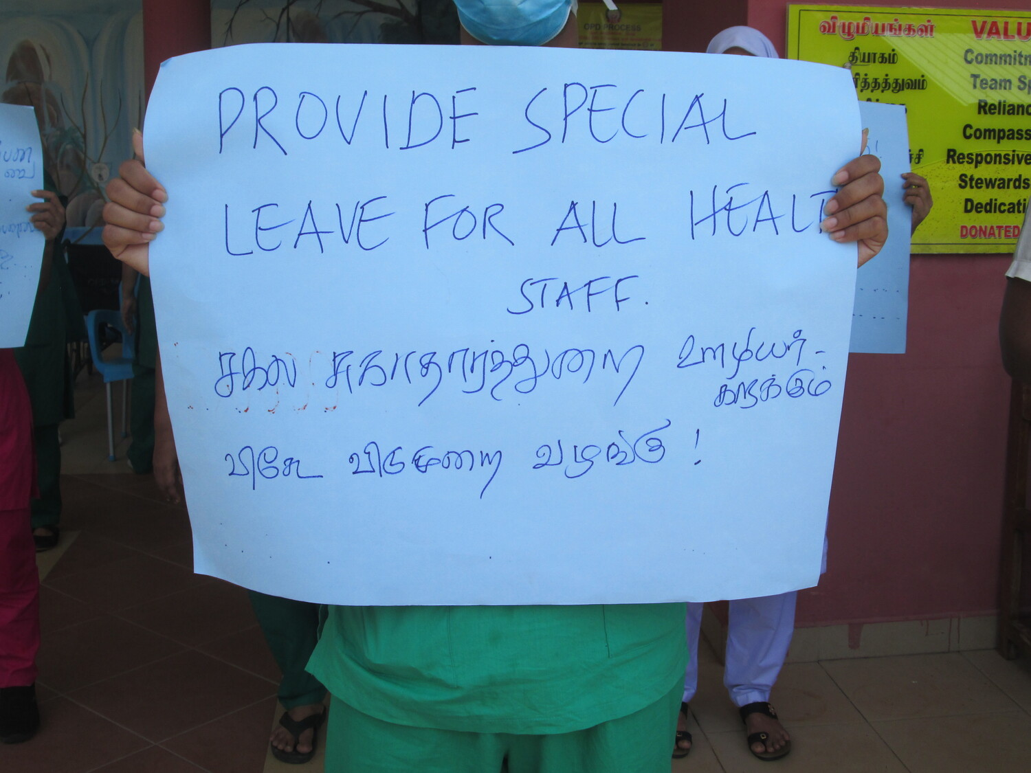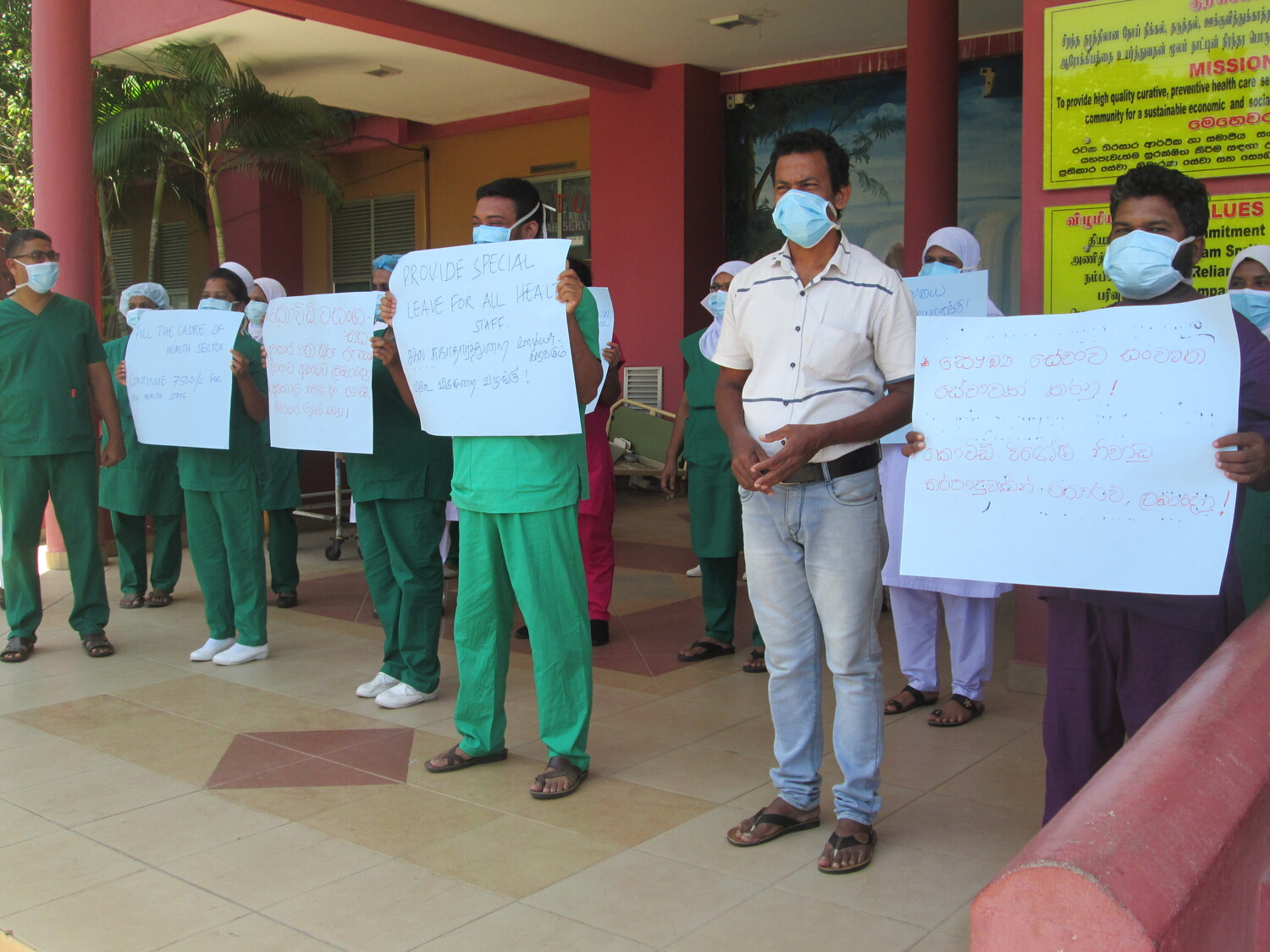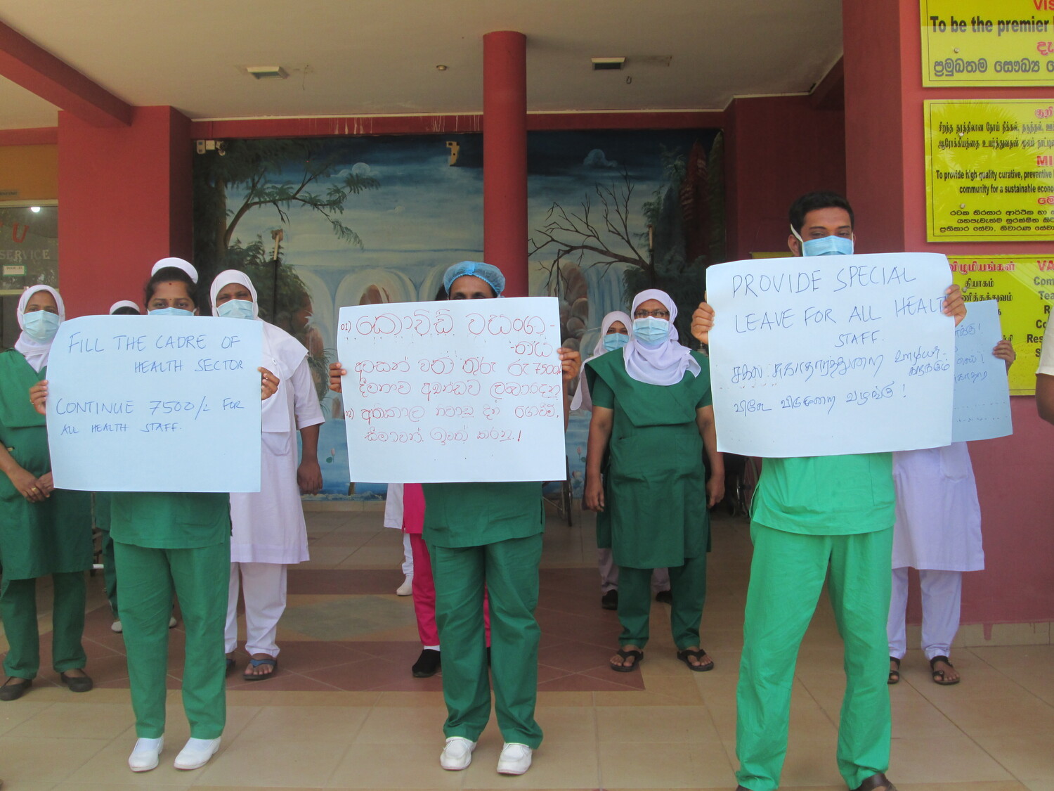 கொவிட் - 19 விஷேட கொடுப்பனவை (அலவன்ஸ் 7500 ரூபாவை) தொடர்ந்து வழங்கு, சுகாதார துறையைத் தேசிய மயமாக்கு, விடுமுறை, ஓய்வுநாள் கொடுப்பனவைக் குறைக்காதே, ஆளணிப்பற்றாக் குறையை நிவர்த்தி செய், கொவிட் கால சேவைக்கால சேவைக்கான விடுமுறையை சகல சுகாதாரத் தொழிலாளர்களுக்கும் வழங்கு என்பன போன்ற பல கோரிக்கைகளைமையப்படுத்திய வாசகங்களைக் கொண்ட சுலோக அட்டைகளை அடையாள பணி பகிஷ்கரிப்பிலீடுபட்ட சுகாதார சேவையாளர்கள் ஏந்தியிருந்ததுடன் அவற்றைக் கோஷமாகவும் எழுப்பினர்.