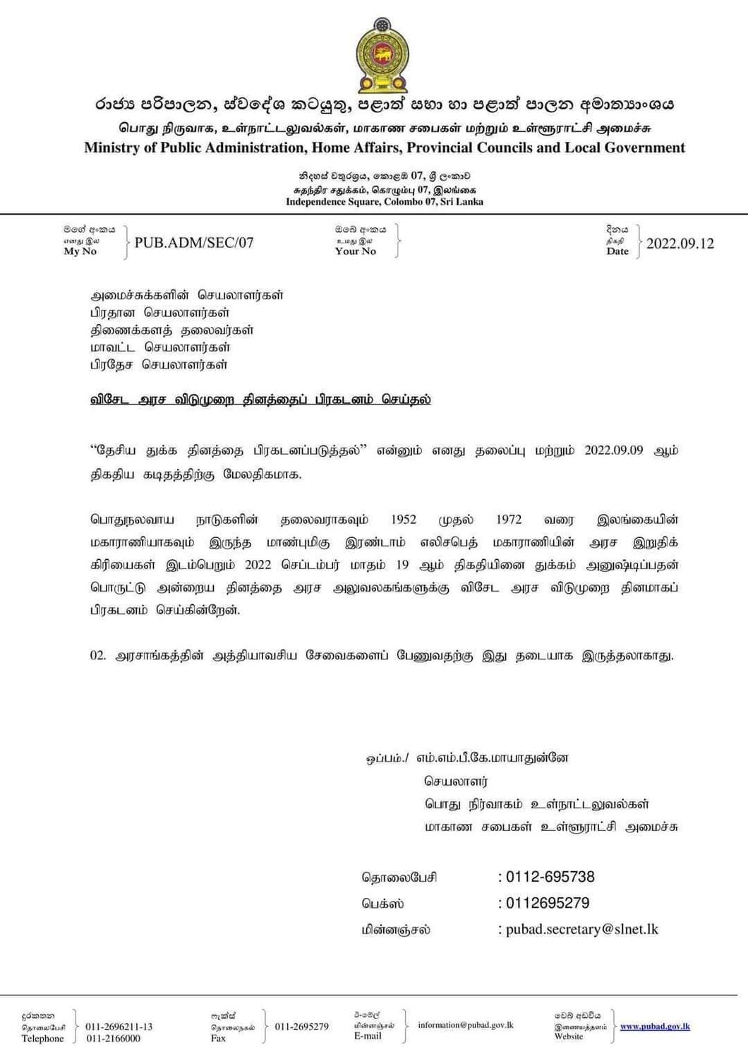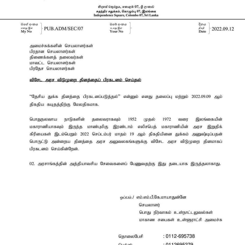 இதன்படி மகாராணியின் இறுதிச் சடங்குகள் நடைபெறவிருக்கும் தினமான எதிர்வரும் 19 ஆம் திகதி திங்கள் கிழமை துக்க தினத்துடன், அரச விடுமுறை தினமாகவும் பொது நிருவாக, உள்நாட்டலுவல்கள் அமைச்சு பிரகடனப்படுத்தியுள்ளது.