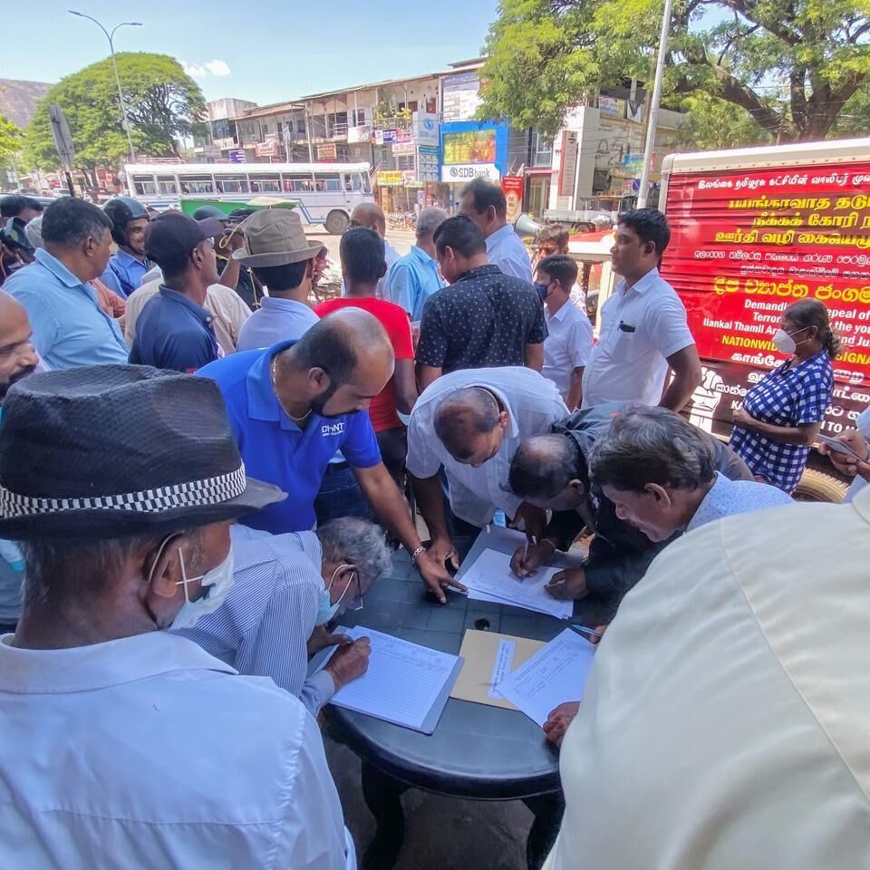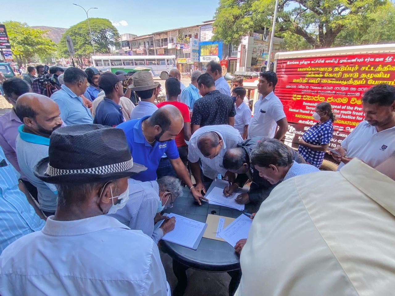பயங்கரவாத தடை சட்டத்தினை நீக்குமாறு வலியுறுத்தி இலங்கை தமிழரசு கட்சியின் ஏற்பாட்டில் காங்கேசன்துறை முதல் ஹம்பாந்தோட்டை வரையில் கையெழுத்துப் போராட்டம் முன்னெடுக்கப்பட்டு வருகின்றது என்பது குறிப்பிடத்தக்கது.
