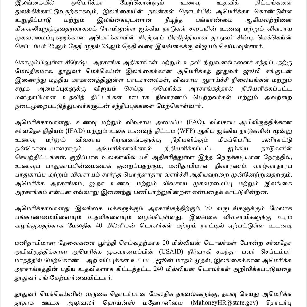 In addition to meeting with senior government officials and aid organizations in Colombo, Ambassador McCain will join U.S. Ambassador to Sri Lanka Julie Chung to travel to Central Province to visit schools, agricultural research facilities, and community organizations and meet with recipients and implementers of relief provided through U.S. government-funded humanitarian assistance programs.